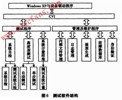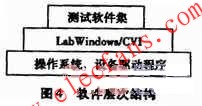 “無(wú)線電高度表測(cè)試系統(tǒng)”軟件主要由操作系統(tǒng)(Windows XP)、設(shè)備驅(qū)動(dòng)程序、開(kāi)發(fā)平臺(tái)LabWindows/CVI和測(cè)試軟件集組成,相互關(guān)系見(jiàn)圖4。