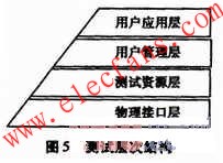 測(cè)試程序在軟件平臺(tái)之上完成,利用軟件平臺(tái)提供的用戶開(kāi)發(fā)接口開(kāi)發(fā)測(cè)試程序,而不通過(guò)設(shè)備驅(qū)動(dòng)程序等低層軟件對(duì)具體的儀器設(shè)備編程。軟件平臺(tái)驅(qū)動(dòng)包括硬件接口、儀器驅(qū)動(dòng)程序等與測(cè)試資源相關(guān)的所有軟件驅(qū)動(dòng),完成軟件平臺(tái)與硬件之間接口驅(qū)動(dòng)。測(cè)試層次結(jié)構(gòu)如圖5所示。