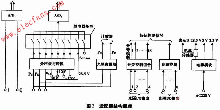 適配器的作用是對(duì)被測(cè)信號(hào)進(jìn)行調(diào)理、分類,使得測(cè)試資源與被測(cè)信號(hào)適配,在模擬被測(cè)對(duì)象和數(shù)字測(cè)試資源之間建立一個(gè)測(cè)試接口。主要由分壓轉(zhuǎn)換、光隔離、開(kāi)關(guān)控制組合、衰減控制組合、電源模塊等組成,其結(jié)構(gòu)如圖2所示。