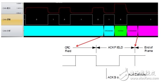 的含義。 下面我們通過一個實例來看看CAN節(jié)點是如何進行ACK SLOT的動作的。我們抓取一個總線上面的信號波形,此波形已經(jīng)是通過82C251解碼過后的。 此主題相關圖片如下: 抓取的波形,圖中