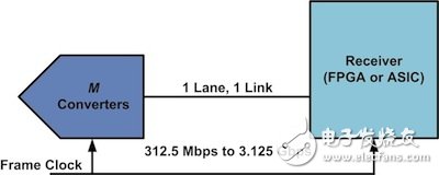 如圖1所示。所示的車道是M個(gè)轉(zhuǎn)換器和接收器之間的物理接口,其中包括利用電流模式邏輯(CML)驅(qū)動(dòng)器和接收器的差分互連對。所示的鏈接是轉(zhuǎn)換器和接收器之間串行數(shù)據(jù)鏈。幀時(shí)鐘路由到轉(zhuǎn)換器和接收器,并提供設(shè)備之間的JESD204鏈接時(shí)鐘。