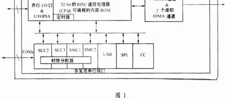 從圖中可以看出,通信處理器模塊CPM支持7個串行信道,包括:2個串行通信控制器SCC,2個串行管理控制器SMC,1個USB接口,1個I2C和1個串行外設(shè)接口SPI。因此,MPC850通過靈活的編程方式可實現(xiàn)對Ethernet、USB、T1/E1等的支持,以及對IEEE802.3/Ethern-et、UART(同步/異步)、HDLC、Transparent、App-leTalk、IrDA等多種通信模式/協(xié)議的支持。