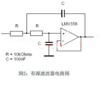 在本設(shè)計(jì)中采用第二種濾波電路,因?yàn)榧蛇\(yùn)放的開環(huán)電壓增益和輸入阻抗均很高,輸出阻抗又低,所以有源濾波電路有一定的電壓放大和緩沖作用,濾波效果好,提高了傳感器信號(hào)的準(zhǔn)確度。