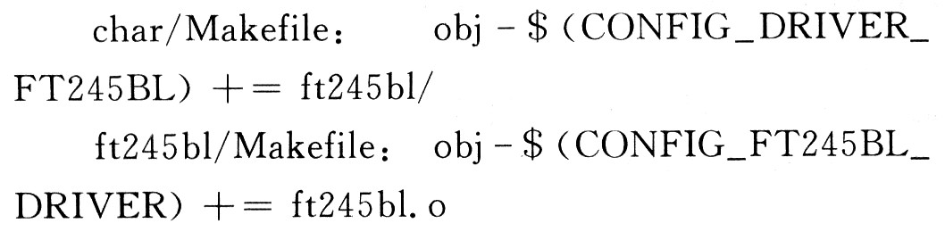 ??? 首先,將編寫好的驅(qū)動(dòng)程序復(fù)制到μClinux系統(tǒng)的文件目錄中。新建ft245bl目錄統(tǒng)一管理USB設(shè)備的驅(qū)動(dòng)文件包括C文件、頭文件、編譯文件、配置文件,存放于目錄μClinux-dist/linux-2.6.x/drivers/char/下,在ft245bl下新建Makefile,并在下面兩個(gè)編譯文件中添加編譯指令: