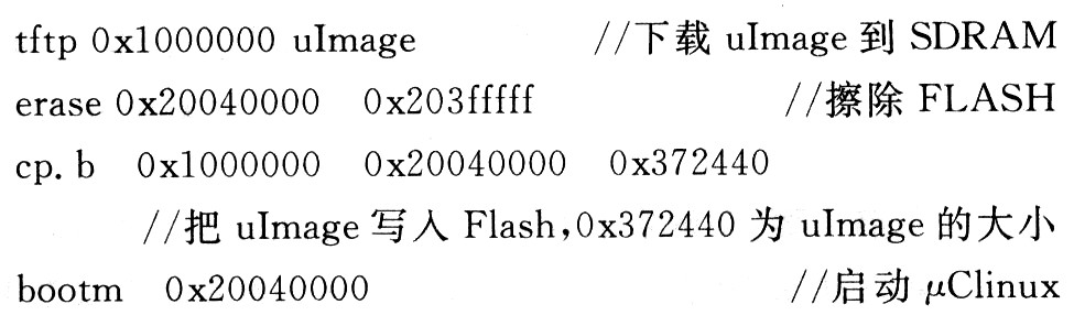 ??? 打開超級(jí)終端μClinux,接通目標(biāo)板電源或按復(fù)位鍵,目標(biāo)板上的u-boot自動(dòng)啟動(dòng),通過超級(jí)終端的串口輸入命令: