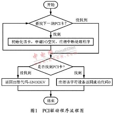 當(dāng)Linux內(nèi)核啟動時(shí),會完成對所有PCI設(shè)備的掃描、登錄和資源分配等初始化操作,并建立起所有PCI設(shè)備的拓?fù)浣Y(jié)構(gòu),此后,在加載PCI驅(qū)動程序時(shí),就會通過加載驅(qū)動程序模塊入口跳轉(zhuǎn)到設(shè)備初始化模塊。Linux2.4內(nèi)核與Linux2.6內(nèi)核的初始化方式是不同的,在Linux-2.4內(nèi)核中,初始化程序首先會使用pci_present函數(shù)來判斷PCI總線是否被內(nèi)核支持,然后使用regiSTer_chrdev函數(shù)來注冊設(shè)備,這樣就可以輪詢PCI總線上的設(shè)備,并利用pci_find_device函數(shù)檢查設(shè)備是否插在總線插槽上。如果在,則保存其所占用的插槽位置信息,并返回pci_dev結(jié)構(gòu),然后將pci_dev結(jié)構(gòu)加入到設(shè)備鏈表中,直到輪詢完畢。圖1所示是Linux下PCI驅(qū)動程序的流程圖。