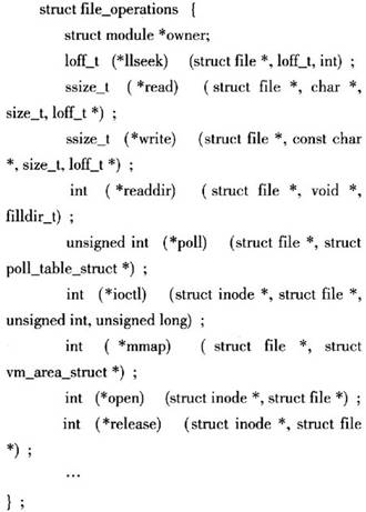 Linux是以操作文件的方式來操作設(shè)備的,也就是通過系統(tǒng)定義的file_operation結(jié)構(gòu)體向Linux文件系統(tǒng)注冊一些操作設(shè)備的函數(shù)。其file_operation結(jié)構(gòu)體的定義如下: