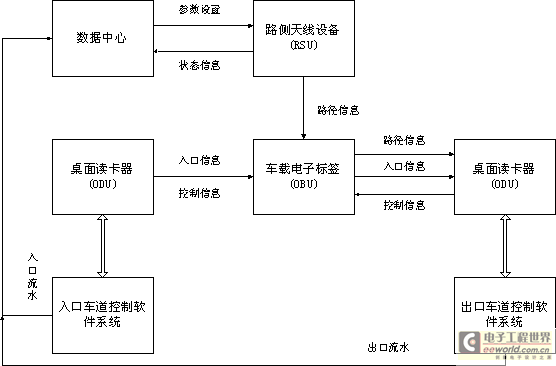 ????? 高速公路RFID多義性路徑識別系統(tǒng)中采用的關(guān)鍵設(shè)備主要有車載電子標(biāo)簽(OBU)、桌面讀寫機(jī)具(ODU)和路側(cè)天線設(shè)備(RSU)。