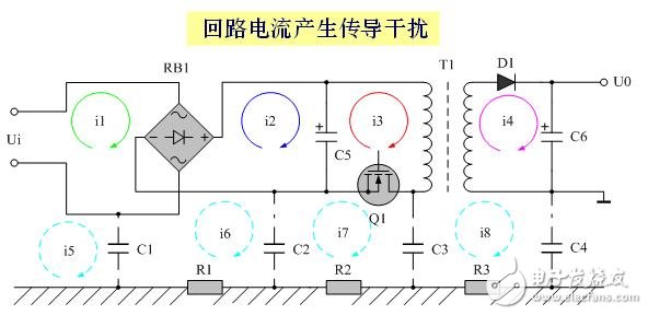 1 傳導(dǎo)干擾分差模干 擾DI和共模干擾CI兩種。先來(lái)看看傳導(dǎo)干擾是怎么產(chǎn)生的。如圖1所示,回路電流產(chǎn)生傳導(dǎo)干擾。這里面有好幾個(gè)回路電流,我們可以把每個(gè)回路都看成是一個(gè) 感應(yīng)線圈,或變壓器線圈的初、次級(jí)