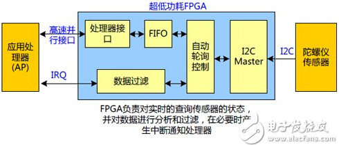 普通傳感器需要處理器不斷的查詢其狀態(tài),使得處理器需要時(shí)刻待命,無(wú)法進(jìn)入睡眠模式,這樣就加大了功耗。通過(guò)超低功耗FPGA可以實(shí)現(xiàn)對(duì)這類傳感器的實(shí)時(shí)查詢,同時(shí)還可以對(duì)數(shù)據(jù)進(jìn)行過(guò)濾和處理,只在有必要的時(shí)候產(chǎn)生中斷通知處理器讀取數(shù)據(jù)。