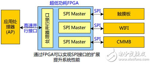 當(dāng)多個(gè)外設(shè)均需要通過(guò)SPI接口與應(yīng)用處理器進(jìn)行通信,速率無(wú)法滿足要求,如何解決?通過(guò)超低功耗FPGA接口轉(zhuǎn)化為高速并行接口與處理器進(jìn)行通信。而且,當(dāng)系統(tǒng)需要兩個(gè)SIM卡時(shí),可以考慮通過(guò)兩個(gè)基帶處理器進(jìn)行控制,通過(guò)超低功耗FPGA可以實(shí)現(xiàn)兩個(gè)處理器間的通信。