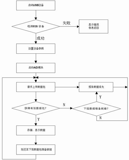 用戶態(tài)的應(yīng)用程序是數(shù)據(jù)采集系統(tǒng)的中心,其主要功能為:開啟或關(guān)閉USB設(shè)備、檢測USB設(shè)備、設(shè)置USB數(shù)據(jù)傳輸管道、設(shè)置A/D狀態(tài)和數(shù)據(jù)采集端口、實(shí)時(shí)從USB接口采集數(shù)據(jù)、顯示并分析數(shù)據(jù)。應(yīng)用程序主流程圖如圖4所示。
