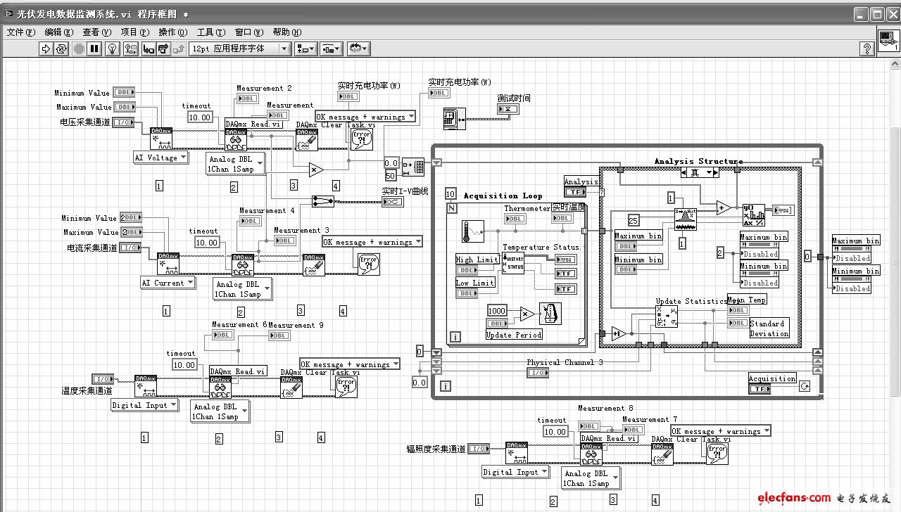 圖5是光伏發(fā)電數(shù)據(jù)監(jiān)測系統(tǒng)前面板對應的部分程序框圖,主要包括電壓采集、電流采集、輻照度采集、溫度采集及其處理程序。