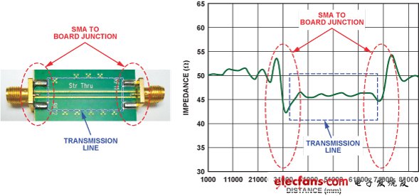 在TDR曲線上,應(yīng)當(dāng)可以標(biāo)出系統(tǒng)中對偏差貢獻(xiàn)最大的具體部分。圖6所示為一條傳輸線路走線及其對應(yīng)的TDR曲線??梢栽赥DR曲線上定位某些部分的阻抗,從而明白哪些部分造成了最大的回?fù)p。從圖中可以看出,SMA與傳輸線路之間的結(jié)點偏離50 Ω,并且傳輸線路本身的阻抗也不是很接近50 Ω。為了改善該PCB的性能,需要采取上面所說的一些措施。