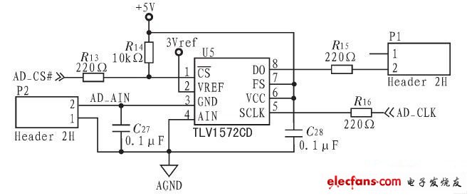 中頻信號分為和差兩路,高速A/D與 DSP 組成的數(shù)據(jù)采集系統(tǒng)要分別對這兩路信號進行采集。對于兩路數(shù)據(jù)采集電路,A/D與DSP的接口連接是一樣的。