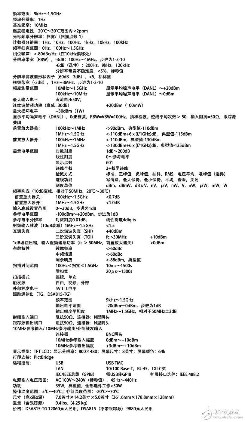 15 ? 二、普源頻譜分析儀DSA815產品參數: 普源頻譜分析儀DSA815主要參數:頻率范圍9kHz~1.5GHz,分辨率帶寬(RBW)10Hz至1MHz,相位噪聲(典型值)-80dBc