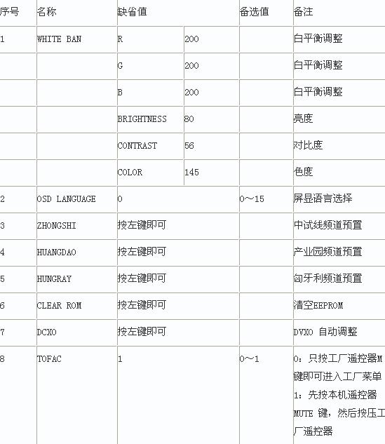 三、機(jī)芯調(diào)試 (一)工廠調(diào)試 先按本機(jī)遙控器MUTE鍵,然后按壓工廠遙控器M鍵,即可進(jìn)入工廠菜單。各個調(diào)整的選項(xiàng)和其參考值見下表: