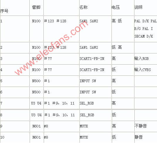 SCART端子的SCART1-VIDEO-IN經(jīng)過射隨輸入到N100(UOC3)的#51,SCART1的R,G,B直接輸入到#78,#79,#80腳。SCART1的Y信號是和SCART1-VIDEO-IN復(fù)用,C信號和SCART1的R信號復(fù)用。經(jīng)N100(UOC3)內(nèi)部解碼后均輸出模擬RGB信號及行場同步信號,其后的信號通路與射頻信號相同,這里不再贅述。