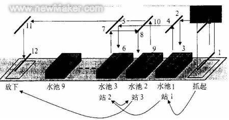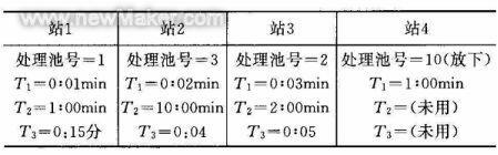 (4) 起重機(jī)將處理過(guò)的工件送入下一個(gè)指定的池中進(jìn)行下步處理(見表1 中站1 : T3 )