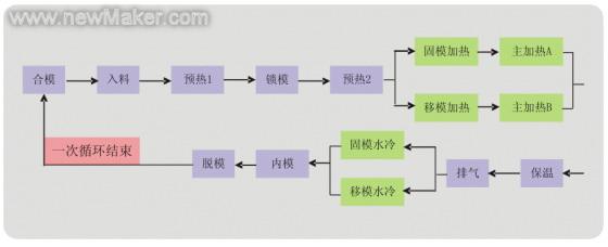 預(yù)吹、入料延時、入料間隙、入料、入料間隔、二次入料、返料、預(yù)熱1、鎖模、預(yù)熱2、穿透次數(shù)、固模加熱、移模排氣、移模加熱、固模排氣、加熱間隔、主加熱A/ B、保溫、排氣、固模/移模水冷、固模排水開/固模排水關(guān)、移模排水開/移模排水關(guān)、模內(nèi)壓、預(yù)開模、固模吹氣/移模吹氣、二次脫模、二次壓模、開模超時。這28項參數(shù)的設(shè)定將很大程度上影響產(chǎn)品的質(zhì)量,用戶可以根據(jù)不同的產(chǎn)品調(diào)整每個工段所需時間的長短,豐富的界面使工藝參數(shù)的設(shè)定非常方便。