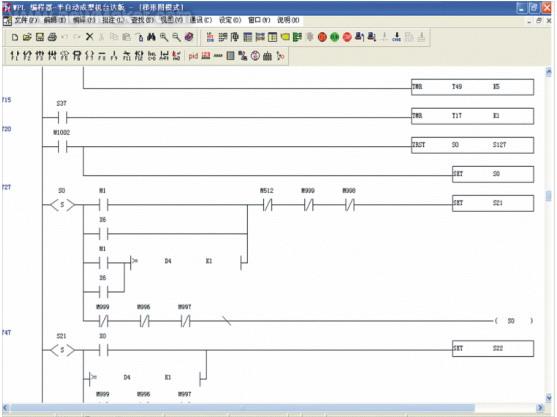 利用臺達簡潔而強大的PLC編輯軟件,采用步進的方式來實現(xiàn)對整個機械的所有邏輯動作。由于畫面上每個動作的執(zhí)行時間都需要非??於鴾蚀_的顯示,因此將PLC和HMI的通訊波特率設(shè)置為19200。這樣人機界面與PLC的通訊能夠保持非常準確的同步,并且整個機器的動作時間非常的快,生產(chǎn)效率非常高。