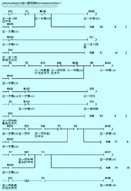 例如第1行,當(dāng)X47置位,表明工裝臺進(jìn)入了圖1中“左一”的B2位置,當(dāng)A2處無工裝板積壓,則M100就被置位并自保持,“左一”開始進(jìn)行這塊工裝臺的移載操作(步驟M100)。到了第2行,Y21會因?yàn)镸100置位而復(fù)位,使該Y21對應(yīng)的阻板氣缸下降,將這塊工裝臺放行,隨B傳送帶進(jìn)入“左一”傳送帶上。第3、4行,當(dāng)工裝臺進(jìn)入“左一”完畢(此時觸動了X44行程開關(guān)),延時1s(T1時間繼電器),然后就根據(jù)條件將M101置位并自保持,程序進(jìn)入步驟M101??梢?,程序?qū)错樞蜻M(jìn)行,直到工裝板被準(zhǔn)確送出“左一”傳送帶為止。