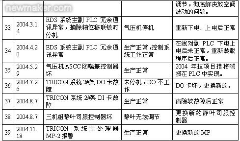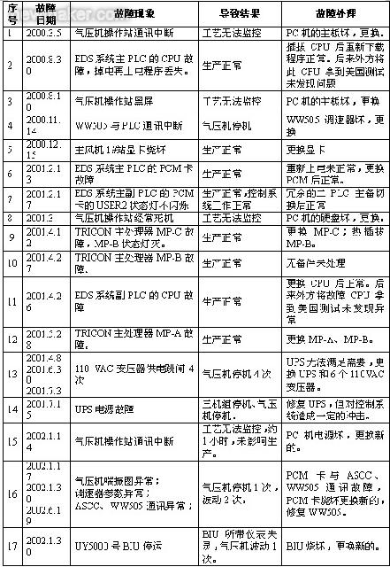 從附表可以看出,在裝置和機(jī)組的運(yùn)行期間,維護(hù)中對各類故障的處理措施基本上可以分幾種情況。系統(tǒng)接地的處理:詳細(xì)檢查接地系統(tǒng),確保儀表專業(yè)接地符合要求;將系統(tǒng)工作地和安全地分開。電源系統(tǒng)的處理:檢查UPS的輸出電壓的精度及各項(xiàng)指標(biāo)滿足要求(由UPS廠家配合進(jìn)行);將UPS輸出端三相四線的中性點(diǎn)N相做接地聯(lián)接;更換UPS電源、6臺變壓器及電源開關(guān)。儀表回路的檢查:將所有儀表回路做了詳細(xì)的檢查。