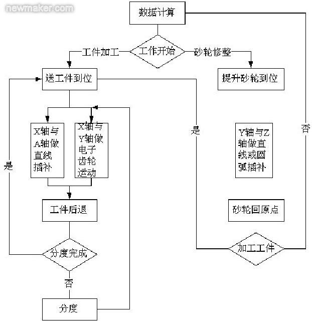 (3)NC(數(shù)控加工中心)系統(tǒng):例如采用三菱的NC E60系統(tǒng),控制三個軸(X+Y+A)實現(xiàn)產(chǎn)品的制作,主要實現(xiàn)了工件的進(jìn)給和工件分度功能,砂輪的修整完全靠液壓系統(tǒng)完成,是目前自動化程度較高的解決方案之一。