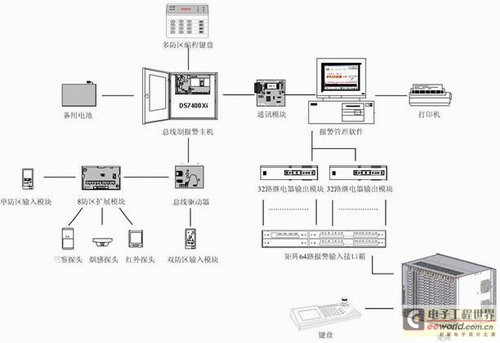 【圖1 總線制報警系統(tǒng)采用硬件連接方式與矩陣通訊】