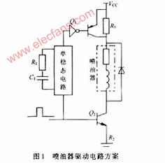 由單片機(jī)發(fā)出的噴油脈沖,分別送入單穩(wěn)態(tài)電路和功放管Q2,單穩(wěn)態(tài)電路輸出窄的開啟脈沖,經(jīng)波形變換后進(jìn)入功放管Q1,這2個功放管均工作在開關(guān)狀態(tài)。當(dāng)單穩(wěn)態(tài)電路輸出的窄脈沖使功放管Q1導(dǎo)通而處于飽和狀態(tài)時,相當(dāng)于電阻R5短路,這時電源提供噴油器的開啟電流。通過調(diào)節(jié)R1C1即可得到適當(dāng)?shù)膰娪烷_啟脈沖寬度。當(dāng)單穩(wěn)態(tài)電路提供的噴油開啟脈沖消失時,功放管Q1截止,這時電源通過R5向噴油器提供保持電流,直到噴油脈沖消失時,功率管Q2也由飽和狀態(tài)變?yōu)榻刂?,噴油器關(guān)閉,噴油結(jié)束。