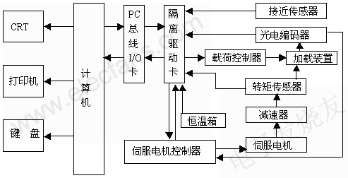 系統(tǒng)采用模塊式結(jié)構(gòu),以計(jì)算機(jī)作為主控制器。計(jì)算機(jī)有著豐富的軟硬件資源和強(qiáng)大的系統(tǒng)功能,運(yùn)算和控制速度高,在現(xiàn)場(chǎng)控制上有著良好的控制 性能。系統(tǒng)其他部分都通過(guò)接口卡與計(jì)算機(jī)相連,被其控制同時(shí)為其提供測(cè)試數(shù)據(jù)。通過(guò)執(zhí)行計(jì)算機(jī)上的接口軟件,系統(tǒng)的硬件結(jié)構(gòu)框圖如圖1所示。主要有以下部 分: