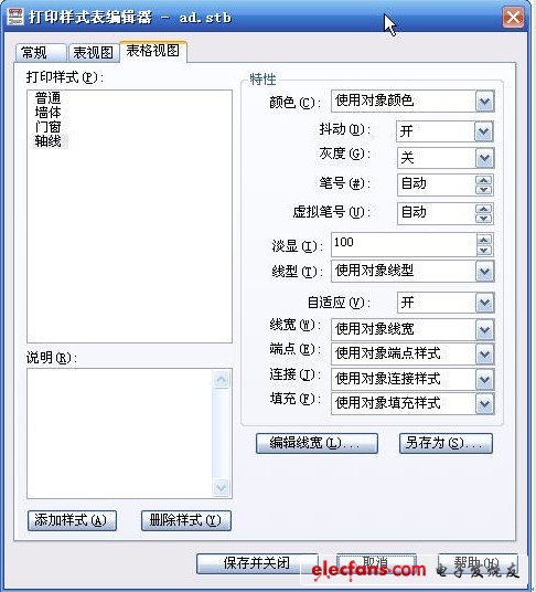 命名相關(guān)打印樣式表的設(shè)置選項(xiàng)跟CTB相同,只是左側(cè)對應(yīng)的不是顏色,而是我們定義的樣式名,如下圖所示。默認(rèn)的STB通常只有一個(gè)“普通”樣式,其他樣式是需要自己添加的,右側(cè)輸出特性設(shè)置與CTB文件相似。