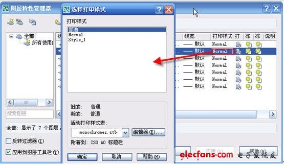 分別打開一個(gè)使用CTB和STB的圖紙,打開圖層管理器,就可以很明顯地看出區(qū)別了,在使用CTB打印樣式的圖紙中,圖層的“打印樣式”一欄是灰色的,不能修改,顯示的就是顏色編號,與圖層顏色對應(yīng),例如設(shè)置為白色,樣式就顯示為color_7。而在使用STB的圖中,“打印樣式”默認(rèn)為“Normal”或“普通”,并且是可以編輯的,單擊后可以在對話框中選擇STB文件中設(shè)置好的樣式,如下圖所示。
