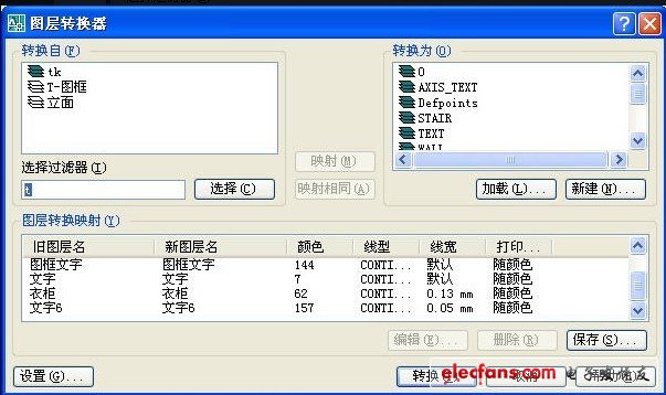 5、設(shè)置好圖層轉(zhuǎn)換映射關(guān)系后,可以點(diǎn)“保存”按鈕,將這個(gè)設(shè)置保存為dwg或dws文件,以便下次使用。
