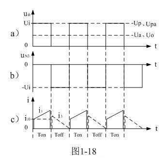 圖1-17中,在Ton期間,控制開關(guān)K接通,輸入電源Ui對變壓器初級線圈N1繞組加電,初級線圈N1繞組有電流i1流過,在N1兩端產(chǎn)生自感電動勢的同時,在變壓器次級線圈N2繞組的兩端也同時產(chǎn)生感應(yīng)電動勢,并向負載提供輸出電壓。開關(guān)變壓器次級線圈輸出電壓大小由(1-63)、(1-69)、(1-76)、(1-77)等式給出,電壓輸出波形如圖1-18-a)。