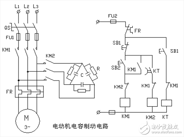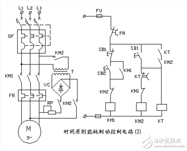 合上電源開關,按起動按鈕SB2,接觸器KM1線圈得電吸合并自保,電動機起動運轉(zhuǎn)。當按停止按鈕SB1時,KM1線圈斷電釋放,其主觸點斷開,定子繞組斷電;同時,KM2、KT線圈得電吸合并,KM2主觸點閉合,電動機二相定子繞組接入直流電源進行能耗制動。使電動機轉(zhuǎn)速迅速下降,當機轉(zhuǎn)接近零時,時間繼電器KT延時時間到。其通電延時斷開的動斷觸點斷開,使KM2、KT線圈相繼斷電釋放,制動過程結(jié)束。