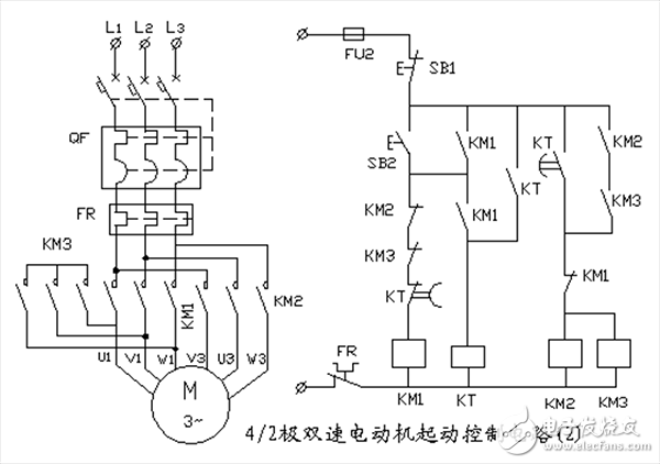 合上電源開關,按起動按鈕SB2,接觸器KM1、KT線圈相繼得電吸合并自保,電動機定子繞組接成三角形接法(△)4極起動;經(jīng)一定時間延時后,KT的通電延時斷開的動斷觸點斷開,KM1斷電釋放,KT的通電延時閉合的動合觸點閉合,KM2、 KM3線圈得電吸合并自保,電動機定子繞組接成雙星形接法(YY)2極運轉(zhuǎn)。
