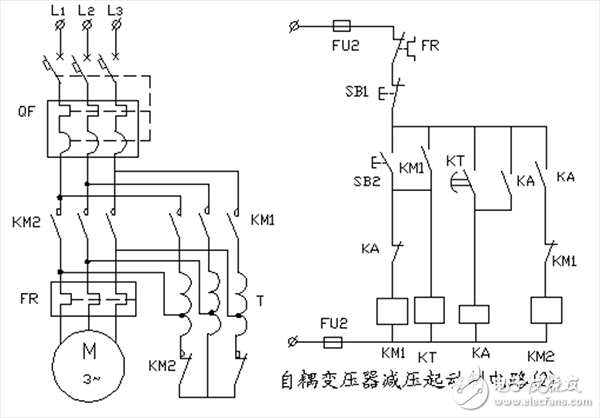 合上電源開關,按起動按鈕SB2,接觸器KM1線圈得電吸合并自保,將自耦變壓器T接入,電動機定子繞組經(jīng)自耦變壓器供電減壓起動;同時,KT線圈得電吸合,計時開始。當KT整定延時時間結(jié)束時,其通電延時閉合的動合觸點閉合,使中間繼電器KA的線圈得電吸合并自保,KM1斷電釋放,其主觸點斷開; KM2線圈得電吸合,其主觸點閉合,自耦變壓器被切除,電動機全壓運行。