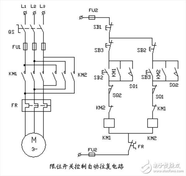 按起動按鈕SB2,KM1吸合并自保,電動機正轉(zhuǎn),帶動機械設備左移。當撞塊碰壓行程開關SQ2時,KM1斷電,KM2得電吸合并自保,電動機反轉(zhuǎn),機械設備右移。當撞塊碰壓行程開關SQ1時,KM2斷電,KM1得電,電動機又正轉(zhuǎn)左移。SB1為停止按鈕。電路由按鈕SB2、SB3及行程開關SQ1、 SQ2的動斷觸點實現(xiàn)了機械聯(lián)鎖,串聯(lián)在交流接觸器線圈KM1、KM2中的KM2、KM1輔助觸點實現(xiàn)了電氣聯(lián)鎖。串聯(lián)在控制電路中的FR常閉觸點,是在電動機過負載或缺相過熱時熱繼電器將控制電路自動斷開,保護了電動機。