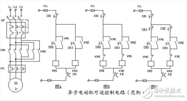 (圖B)原理同圖A。在KM1線圈電路中串接了KM2的一個動斷觸點:同樣,在KM2線圈電路中串接了KM1的一個動斷觸點。這兩個動斷觸點稱互鎖觸點,這種互鎖稱電氣互鎖。保證了任何時候只有一只接觸器吸合,避免了電源短路。缺點:必須先按停止按鈕SB1,電動機停轉(zhuǎn)后,才能起動電動機的另一旋轉(zhuǎn)方向。