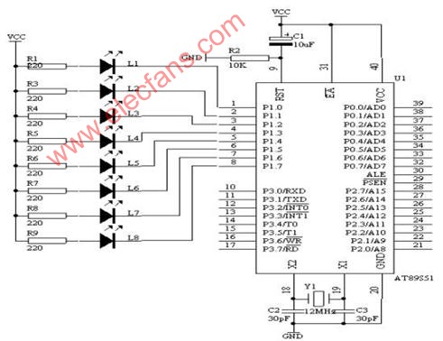 把“單片機(jī)系統(tǒng)”區(qū)域中的P1.0-P1.7用8芯排線連接到“八路發(fā)光二極管指示模塊”區(qū)域中的L1-L8端口上,要求:P1.0對(duì)應(yīng)著L1,P1.1對(duì)應(yīng)著L2,……,P1.7對(duì)應(yīng)著L8。