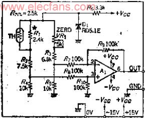 VR1是可變電阻,其作用是使輸出電壓在規(guī)定溫度時(shí)等于0,當(dāng)熱敏電阻與各臂電阻相等時(shí),調(diào)VR1使電橋平衡。