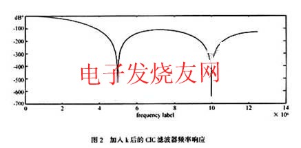 由于采樣后的數(shù)字信號(hào)頻譜是原模擬信號(hào)頻譜按照采樣率為周期進(jìn)行延拓,為了保證信號(hào)在抽取的過(guò)程中不會(huì)造成基帶頻譜混疊,所以要對(duì)有可能混進(jìn)基帶頻譜的部分進(jìn)行濾除。鑒于這種考慮,在多級(jí)濾波器的第一級(jí)采用梳狀濾波器,而對(duì)位于基帶和阻帶之間的過(guò)渡帶則通過(guò)后面的濾波器進(jìn)行濾除。