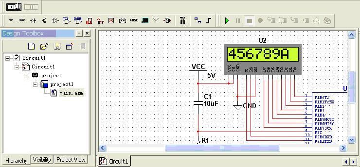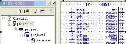 7、保存好以后,在左側(cè)的“Design Toolbox”中左鍵單擊“Circuit1”前面的“+”號(hào),然后一直點(diǎn)擊“+”號(hào),一直找到“main.asm”,雙擊該文件,在原圖紙欄出現(xiàn)了編程界面,然后在該界面中輸入以下程序: