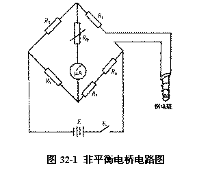 式中 R0 、 Rt 分別為 0 ℃和 t ℃時(shí)的電阻值, A 、B 為溫度系數(shù)(出廠時(shí)廠家會給定).利用金屬的這種性質(zhì)來測量介質(zhì)溫度的儀器稱為電阻溫度計(jì),它一般是由銅電阻體和不平衡電橋組合而成 . 由于銅電阻的電阻值是溫度的函數(shù),測出電阻就可以確定對應(yīng)的溫度,所以這種方法的實(shí)質(zhì)就是測電阻 . 但是如果每測一次電阻從表上查一次對應(yīng)的溫度,仍然不十分方便,為使溫度測量能連續(xù)進(jìn)行,即從電表表面刻度讀數(shù)連續(xù)地反應(yīng)出溫度的變化,一般采用非平衡電橋來實(shí)現(xiàn),其電路如圖 32-1 所示 .其原理是:當(dāng)電橋的四個(gè)橋臂上電阻配合 適當(dāng) ( 一般 R 2 = R3)電橋可以達(dá)到平衡,此時(shí)電流表上無電流通過 . 一旦當(dāng)其中銅電阻 R l 隨溫度改變而阻值隨之發(fā)生變化時(shí),從而使電橋偏離平衡,電流表中將有電流流過 .如果電源電壓保持不變,那么一定溫度 t 對應(yīng)一定 的 R t ,而 Rt又對應(yīng)一定的 I t 即為相應(yīng)的電表偏轉(zhuǎn)量 .所以表中通過的電流強(qiáng)度就直接與溫度變化有關(guān) . 這樣由于測試變化引起的橋臂 R t 電阻值的變化可以直接由電表指針偏轉(zhuǎn)大小來決定.只要事先對電表進(jìn)行標(biāo)定,就可以根據(jù)電流表的讀數(shù)來表示測量溫度的大小 .