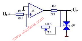 (1)按圖接線,并將Rf調(diào)為100k,Vi接DC電壓源,測(cè)出Vo由+Vom→-Vom時(shí)Vi的臨界值。