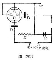 安裝電源和示波器、并加以調(diào)整,使一個(gè)清晰的聚焦光點(diǎn)顯現(xiàn)在熒光屏中央。按圖38/7安裝電路,其中R是3000Ω的電阻,M是2CZ11A硅整流二極管,T1和T2是50-100V交流電源(即小型自耦變壓器輸出)接線柱,X1、X2、Y1和Y2是偏轉(zhuǎn)極板,T3和T4是示波器的輸入接線柱。
