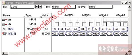 該波形圖有兩個(gè)輸入結(jié)點(diǎn) Ctrl和CLK,一個(gè)隱含狀態(tài)結(jié)點(diǎn) State,4位輸出結(jié)點(diǎn)? Q[3..0]。各個(gè)節(jié)點(diǎn)的的編輯如圖2-1所示。