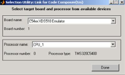 ??? 在對DSP 進(jìn)行操作之前,應(yīng)該首先建立一個(gè)DSP 目標(biāo)。對于配置了多DSP 系統(tǒng)的用戶,CCSLink 提供了兩種選擇DSP目標(biāo)的工具:ccsboardinfo 函數(shù)和boardprosel 圖形用戶界面,用戶可以根據(jù)返回值和自己需求選擇相應(yīng)的對象。以采用圖形用戶界面為例,若配置有XDS510 Emulator 和C5416 Simulator 二種DSP 系統(tǒng),運(yùn)行[boardNum,procNum] = boardprocsel,則MATLAB 通過對CCS 配置的自動(dòng)檢測,出現(xiàn)圖2 所示的目標(biāo)選擇界面。本文根據(jù)需要選擇硬件仿真器C54xxXDS510Emulator 并點(diǎn)擊Done,則可返回板卡編號和處理器編號: