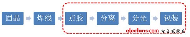 COB封裝流程和SMD生產(chǎn)流程相差不大,但是COB封裝在點(diǎn)膠,分離,分光和包裝上的封裝效率要高更多,和傳統(tǒng)SMD相比可以節(jié)省5%的任何和物料費(fèi)。